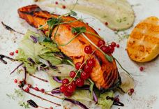 Филе лосося в хрустящей медовой глазури на подушке из микс салата с муссом из авокадо