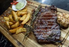 Мраморное кусок говядины обжаренное на гриле желаемой вами прожарки, подается с ароматным зеленым маслом и запеченном чесноком в виде гарнира картофельные дольки