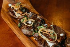 Три куска жаренной говяжьей вырезки с шампиньонами на гриле перечным соусом и луковыми чипсами